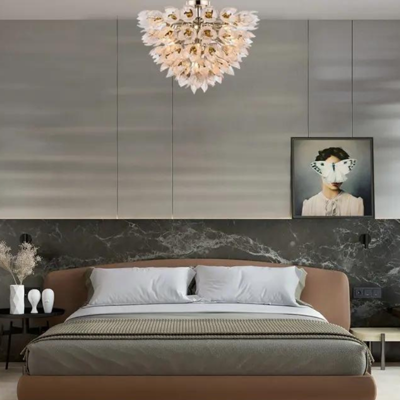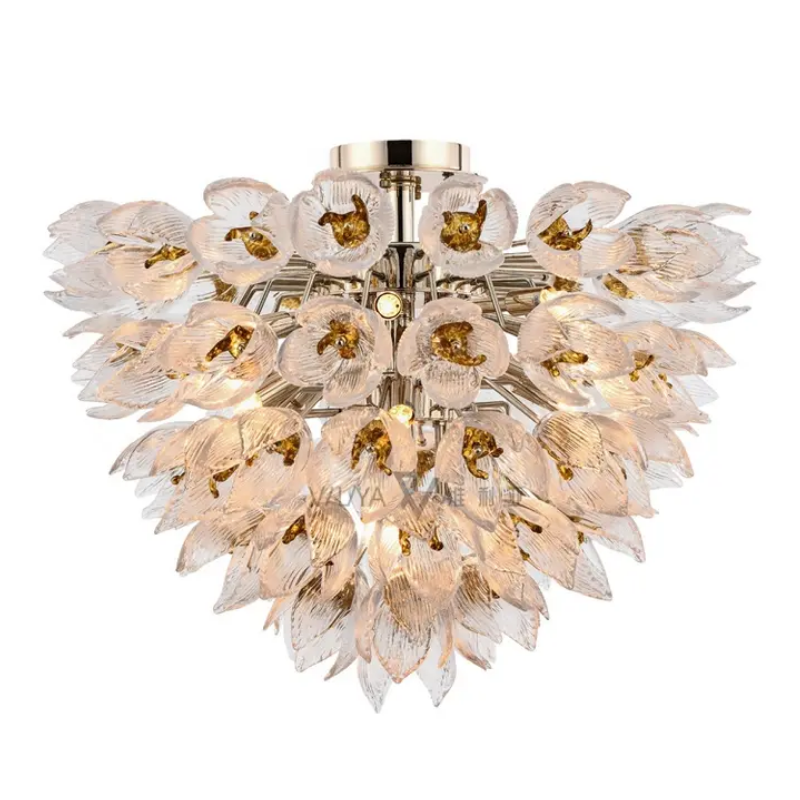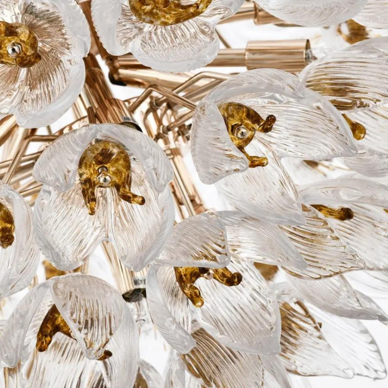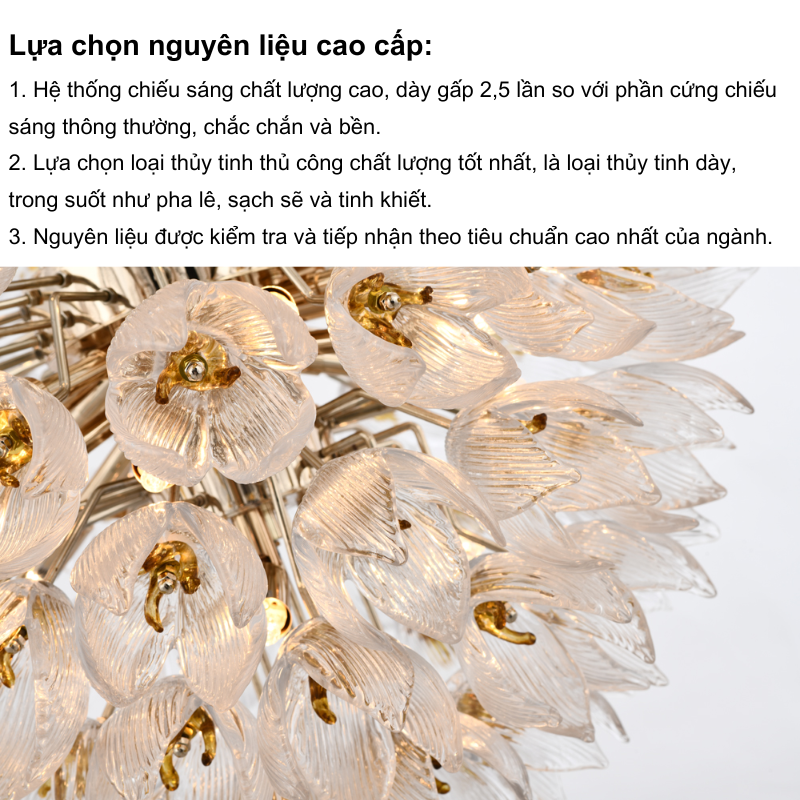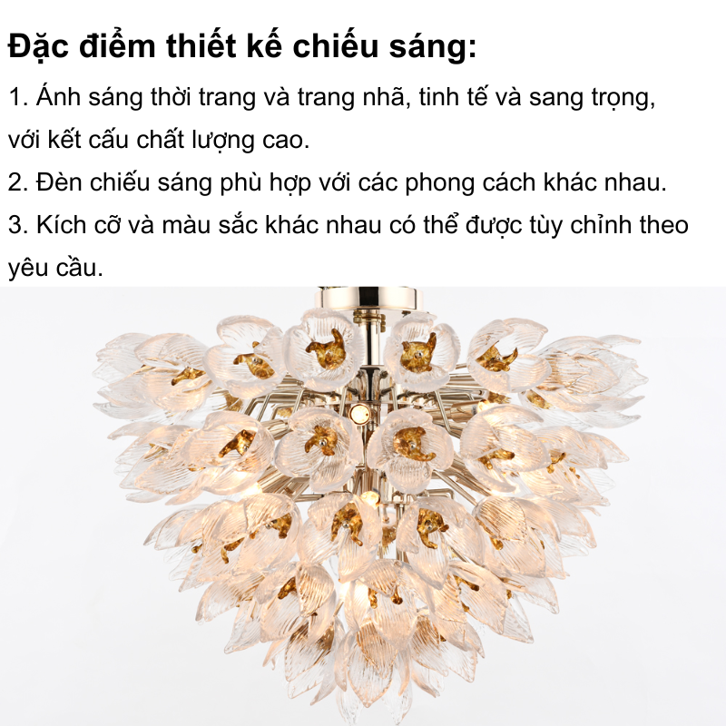 Đèn trang trí Jemen mang vẻ đẹp hoang dại và đầy cuốn hút, lấy cảm hứng từ những bụi hoa gai góc vươn mình mạnh mẽ giữa thiên nhiên. Các cánh hoa thủy tinh tinh xảo với gam màu vàng nhạt được sắp xếp khéo léo, giống như những bông hoa bung nở giữa không gian, tạo nên vẻ đẹp vừa mềm mại vừa gai góc. Ánh sáng dịu dàng chiếu qua các cánh hoa trong suốt, tạo nên hiệu ứng lung linh và huyền ảo.